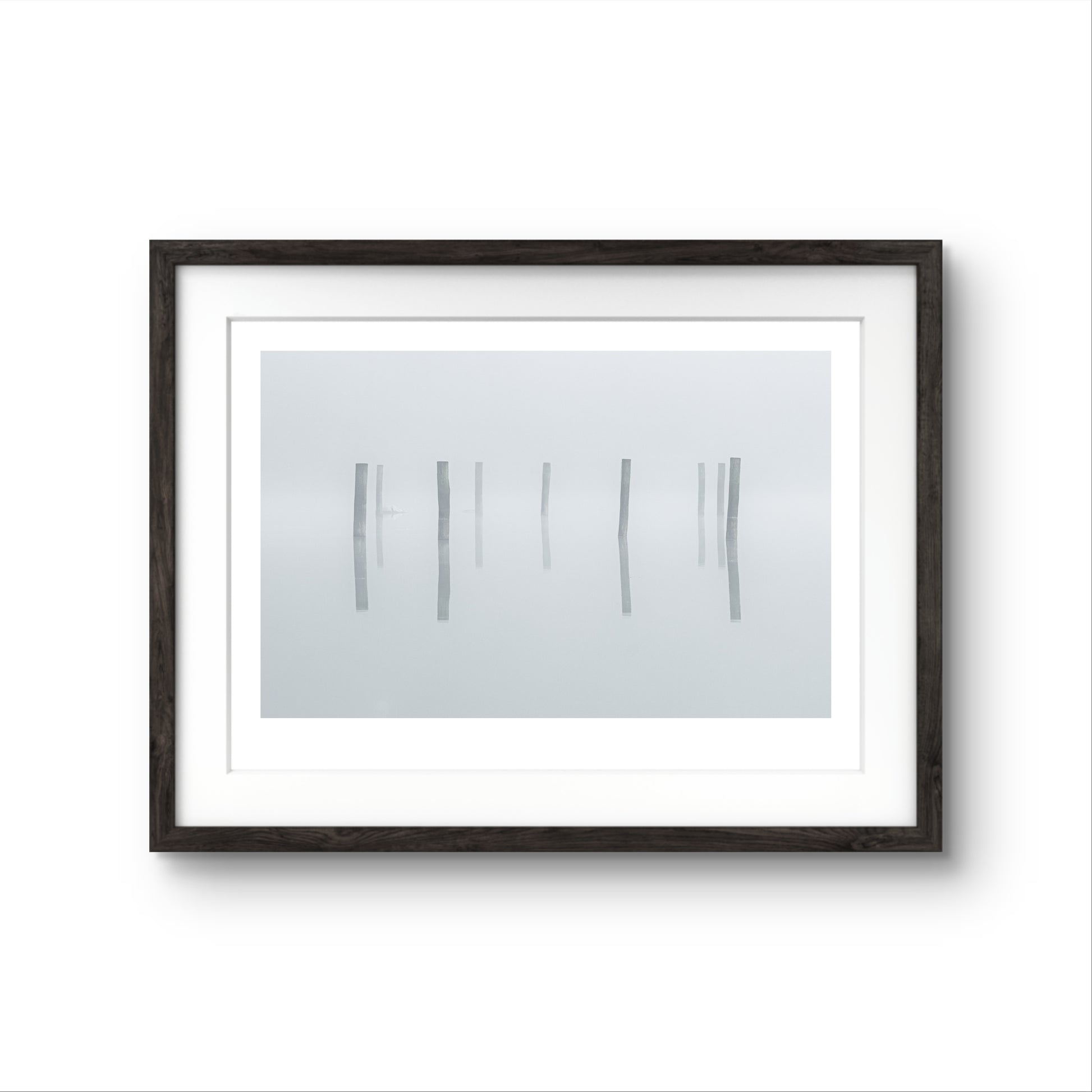 Smuk og stemningsfyldt kunstfotografi af pæle og deres reflektion i vandet. Billedet er taget en tidlig tåget morgen i det fynske.